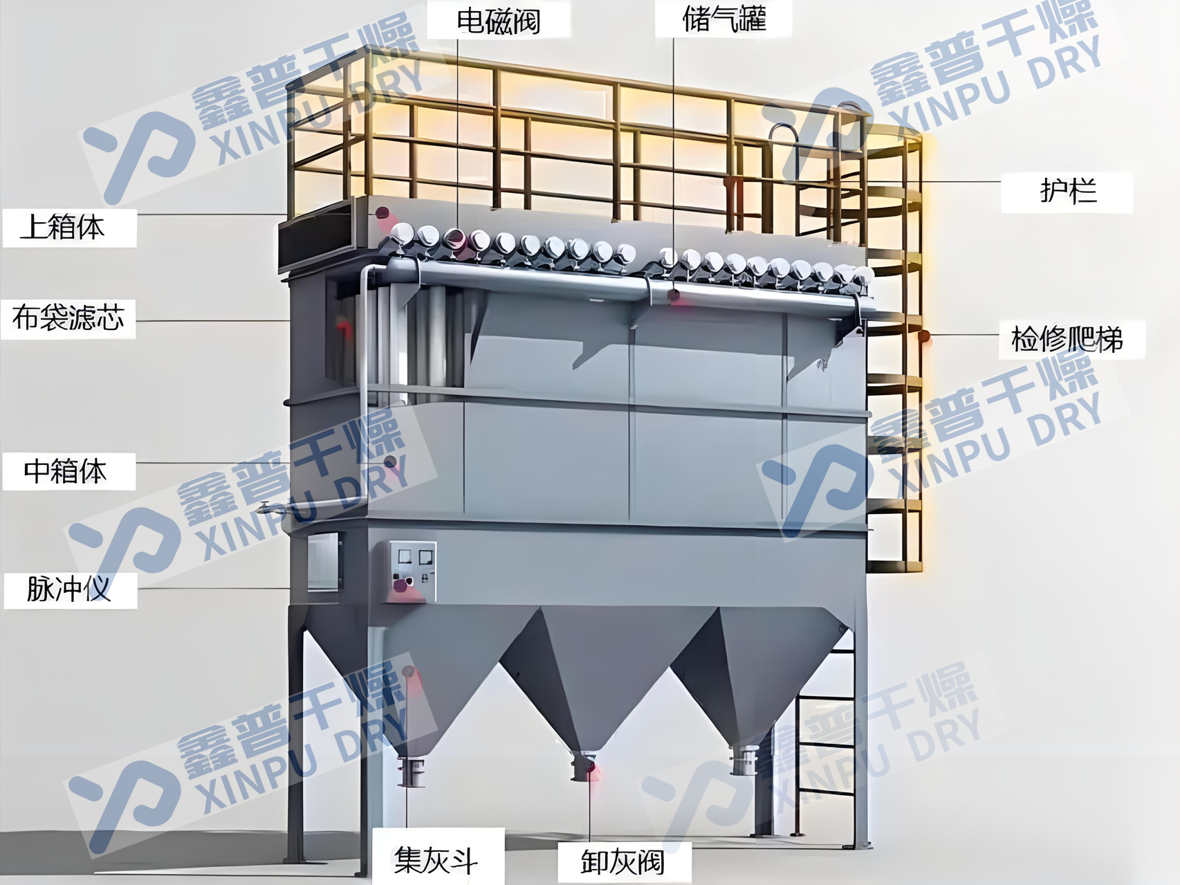 含尘气流从进气口进入箱体后,部分沉降,轻微粉尘浮动时被滤袋阻留,净化空气透过滤袋,经文氏管进入上箱体,从出气口排出。积附在滤袋外壁的粉尘不断增加,当阻力在限定的范围内(一般为80-120毫米水柱),就要清除积附的滤袋外壁的粉尘,清灰是由控制器顺序触发各控制阀,使气包内的压缩空气由喷吹管孔喷出(一次风),通过文氏管诱导数倍于一次风的周围空气(二次风)进入滤袋,使滤袋在一瞬间急剧膨胀并伴随着气流的反作风,抖落粉尘,被抖落的粉尘落入灰门经排灰阀排出机体。