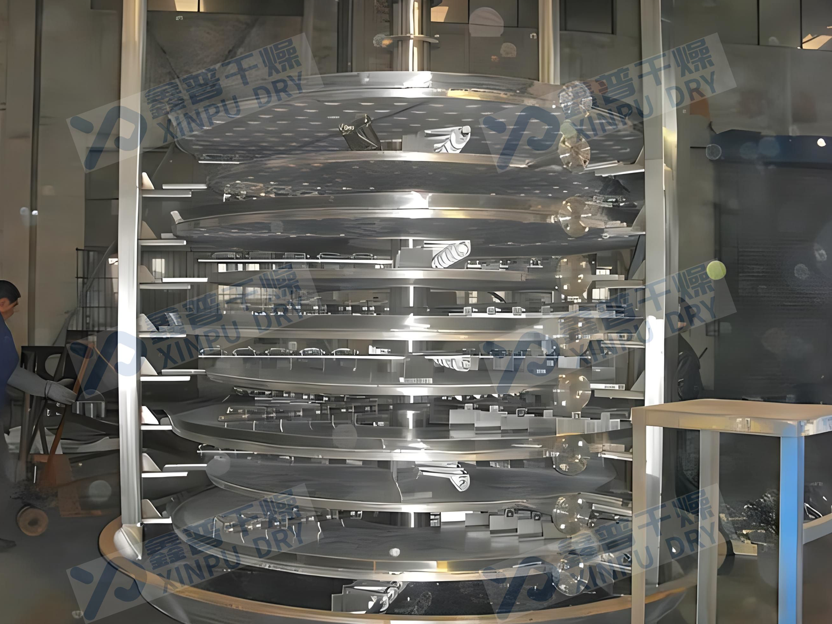 湿物料自加料器连续地加到干燥器上部第一层干燥盘上,带有耙叶的耙臂作回转运动使耙臂作回转运动使耙叶连续地翻抄物料。物料沿指数螺旋线流过干燥盘表面,在小干燥盘上的物料被移送到外缘,并在外缘落到下方的大干燥盘外缘,在大干盘上物料向里移动并从中间落料口落如下一层小干燥盘中。大小干燥盘上下交替排列,物料得以连续地流过整个干燥器。中空的干燥盘内通入加热介质,加热介质形式有饱和蒸汽、热水和导热油,加热介质由干燥盘的一端进入,从另一端导出。已干物料从^后一层干燥盘落到壳体的底层,^后被耙叶移送到出料口排出。湿份从物料中逸出,由设在顶盖上的排湿口排出,真空型盘式干燥器的湿气由设在顶盖上的真空泵口排出。从底层排出的干物料可直接包装。通过配加翅片加热器、溶剂回收冷凝器、袋式除尘器、干料返混机构、引风机等辅机,可提高其干燥的生产能力,干燥膏糊状和热敏性物 料,可方便地回收溶剂,并能进行热解和反应操作。